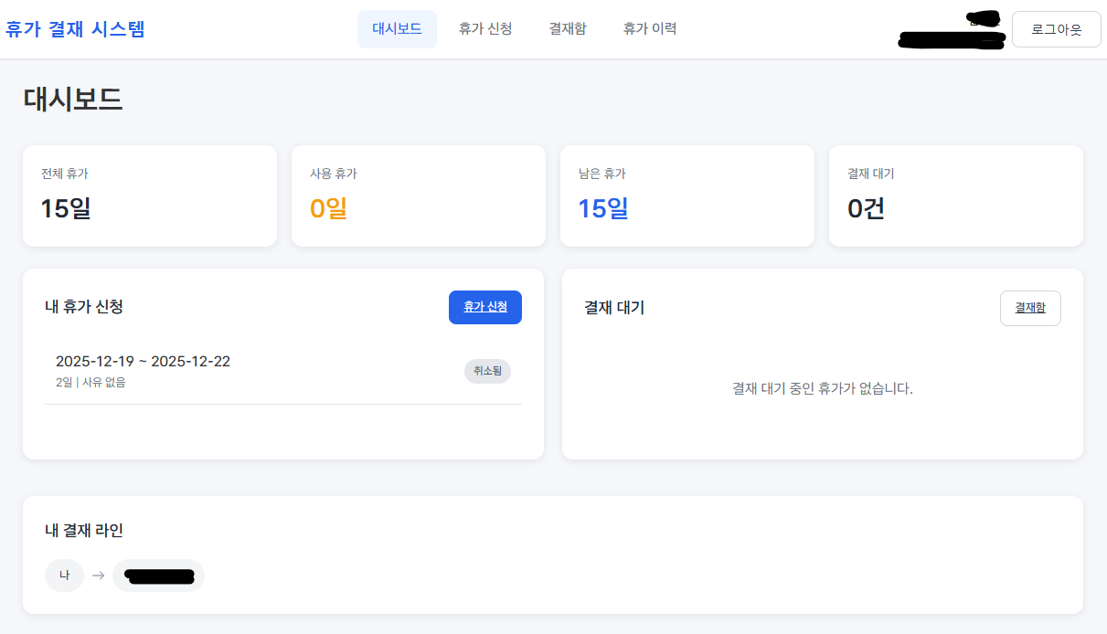 - 기본적인 기능은 각 사용자는 자신이 원하는 날짜를 선택해서 결재를 신청할 수 있고, 결재가 신청이 되면 결재라인을 따라(사람마다 다름. 예를들면 부장-이사-사장) 결재 신청이 한단계씩 올라가고 결재신청을 반려할 수도 있어.