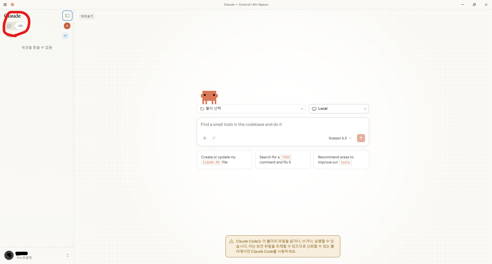 설치된 클로드를 실행하면 다음과 같은 창이 뜨는데 이때 세션 쪽을 선택하면 내 컴퓨터에 있는 프로젝트 폴더에 클로드를 접근시켜 작업을 할 수 있게 된다. (물론 ide에 직접 연결하는 것보다는 성능이 떨어진다.)