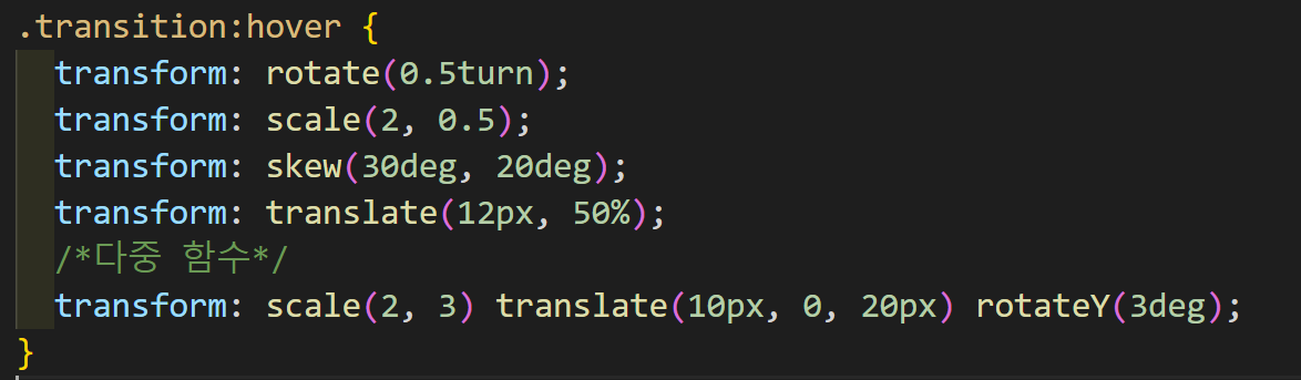 | scale(2, 3) | width 2배, height 3배 확대. 축소하고 싶을 땐 1보다 작은 값 써주기. |