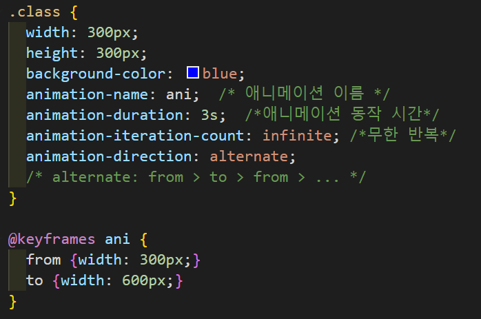 animation을 사용할 때는 @keyframes를 항상 같이 써줘야 한다. keyframes와 연결하기 위해 animation-name이 필요하다.