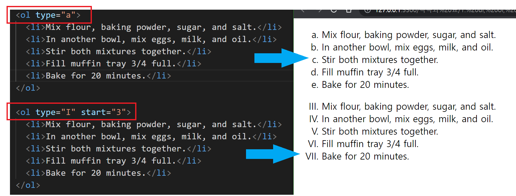 ordered list. 순서가 있는 리스트. 기본값은 숫자로 순서를 매기고 type으로 소문자(a), 대문자(A), 로마자(i, I) 등을 지정하여 순서를 매길 수 있음.