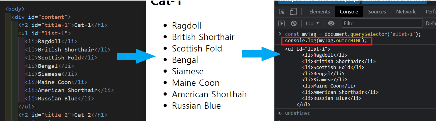 > innerHTML처럼 노드 내부의 값에 새로운 값을 할당해 주는 역할을 하는데 텍스트만 다루기 때문에 특수문자도 모두 텍스트로 취급한다. 즉, 위의 사진에서 mytag에 outer를 사용하여 <ul> 리스트를 만들어 줄 때 만약 textContent를 사용했다면 웹페이지 화면에 <ul> 태그까지 출력해버린다는 것이다.