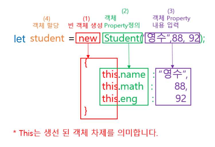 위의 그림은 Student라는 생성자 함수를 이용해 student라는 객체를 만드는 과정이다.