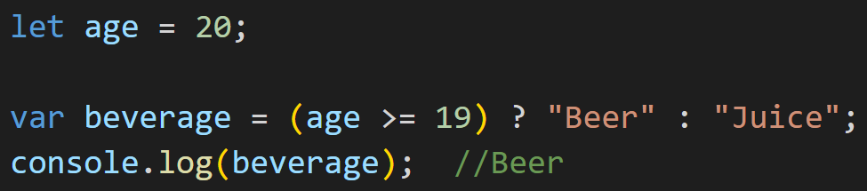 age에 20을 할당했으므로 조건을 만족하여 '참' 자리에 있는 beer가 beverage에 할당된다.